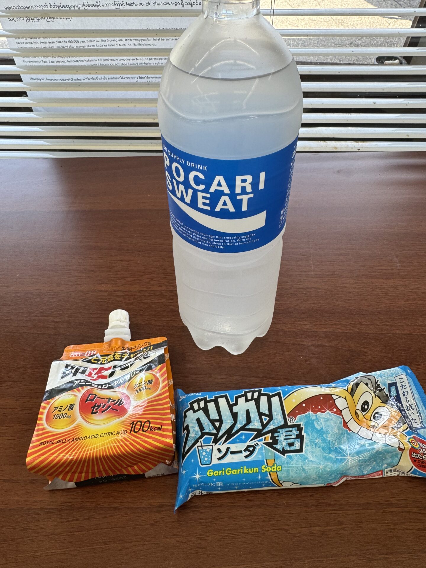 今回の大発見。コンビニに売っている冷凍ペットボトルを背中に入れるとかなり熱中症が改善されることがわかりました!これ以降は背中にペットボトルを入れながらライドです。