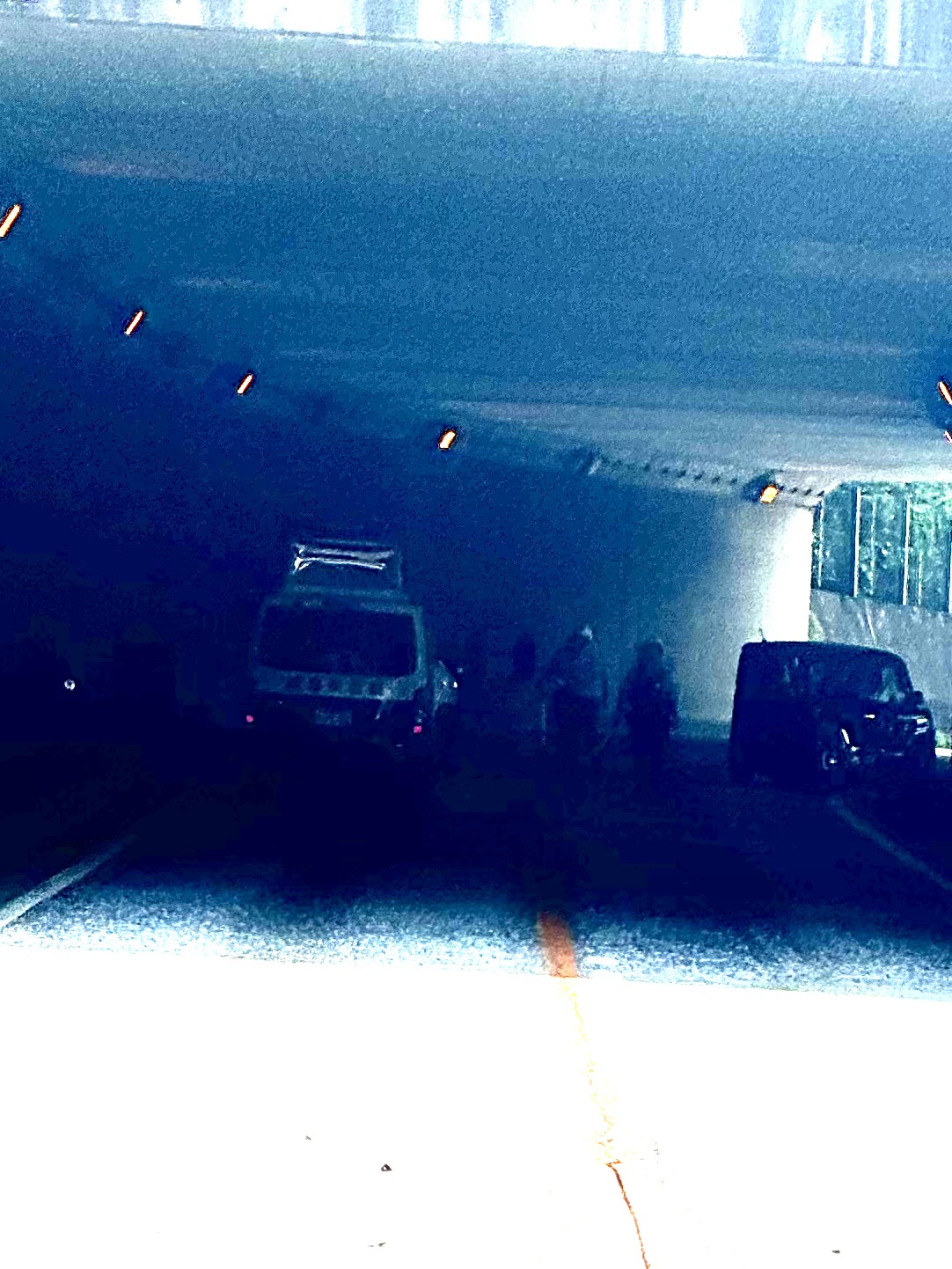 追い越し禁止車線のトンネル内で正面衝突してた。