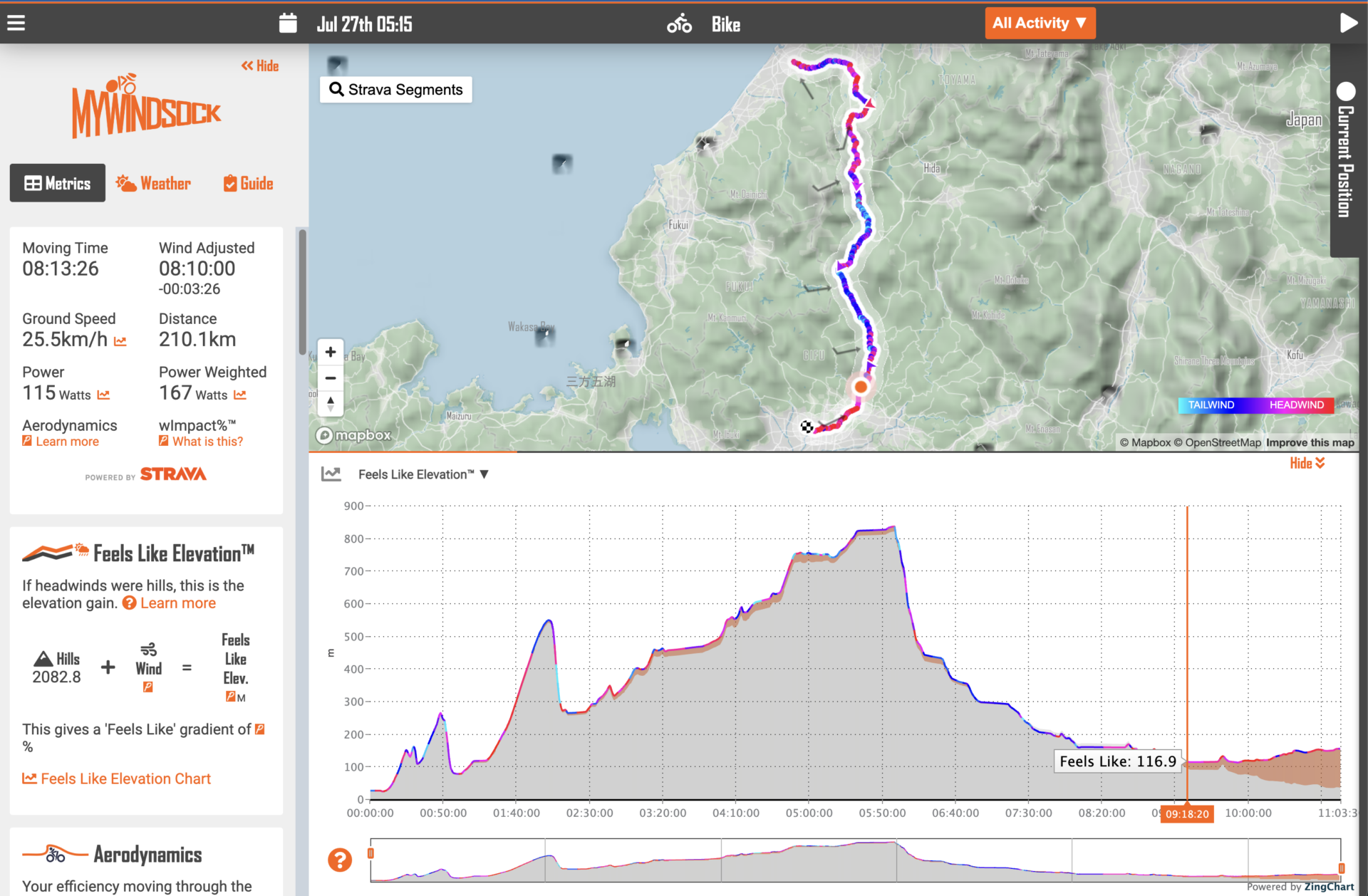 6割程度向かい風とのことでしたが、9割程度向かい風だったと思います。。。しかも予報以上に強いです。下りでも減速するくらいなので。
