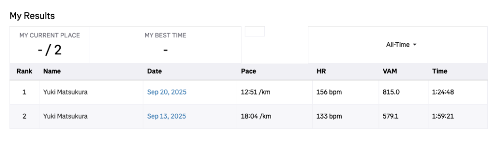 D+1300mを1回目は2時間、その1週間後には1時間24分で登れました。1回登山しておけばこんなに大きな差が出るくらい登山能力は向上します。