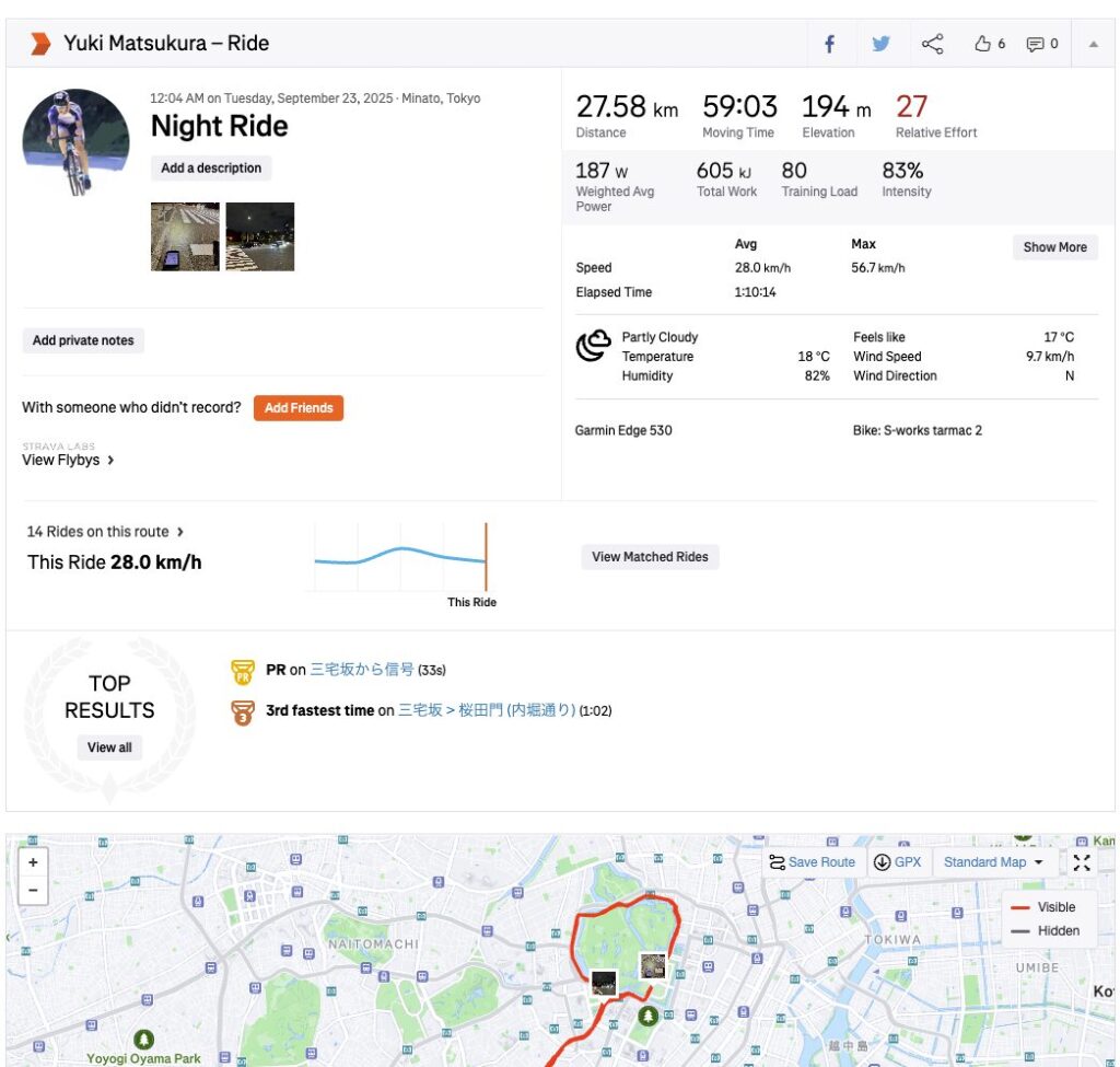 皇居は、夜に4周バイクで走るのを1セットとして約1時間練習してました。最近の皇居は道路舗装がきれいになったので自転車で走りやすいです。坂も1箇所あるのでそこでタイムトライアルをすることで追い込みました。