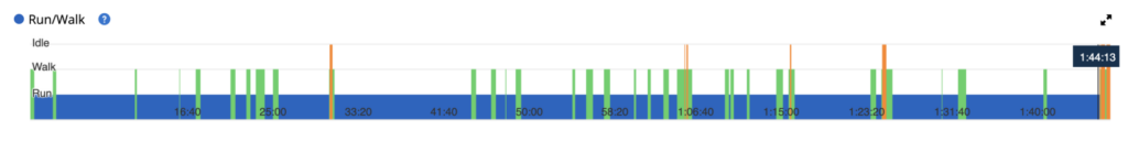 しかしながら開始3kmぐらいにある山田峠で辛くなって歩きを入れ始めます。以下のグラフのピンクで下の方まで来ているのはエイドステーションでの立ち止まり。少し凹んでいるのは歩きって感じです。