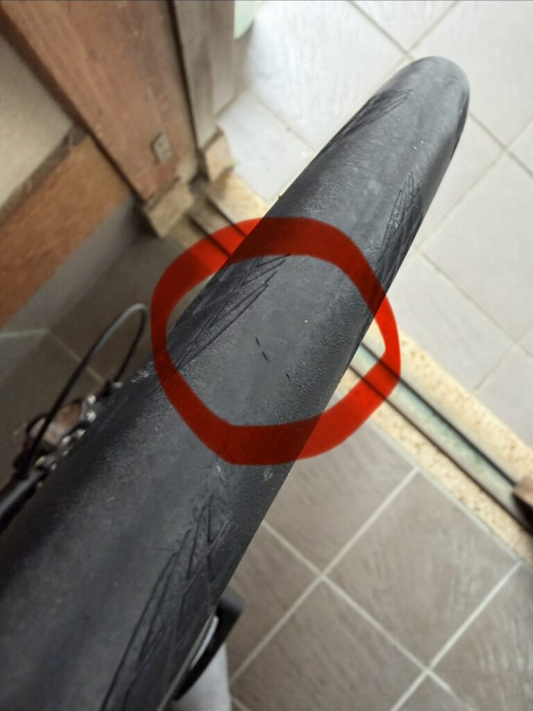 帰宅してタイヤをチェックしたら何かが刺さった跡がありました。