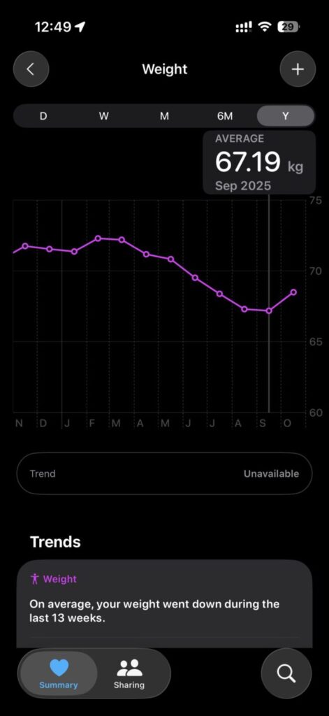 体重はトレーニングを始めた5月あたりからマイナス5kg。