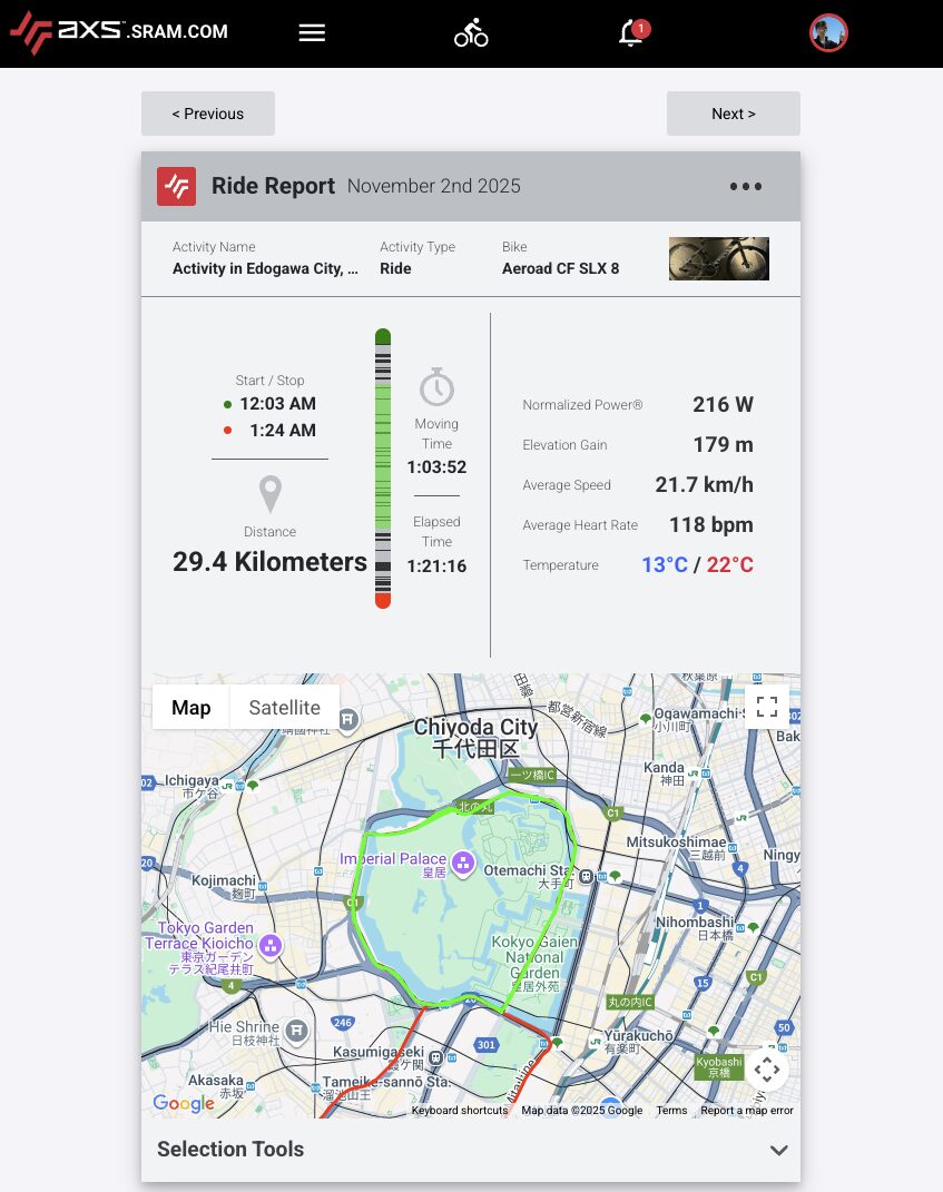SRAMのAXS Webサービスを利用することで、これまで確認が難しかった電動変速の情報をグラフィカルに分析できます。