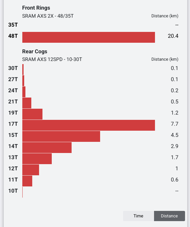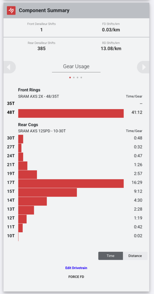 次に、コンポーネントの情報が表示されます。初期状態では、ギアごとの使用時間がヒストグラムで表示されます。ここで表示されている歯数(ギアの歯の数)の情報は、下に表示されている「Edit Drivetrain」で変更できます(初めて利用する場合は、ここで初期設定が必要です)。