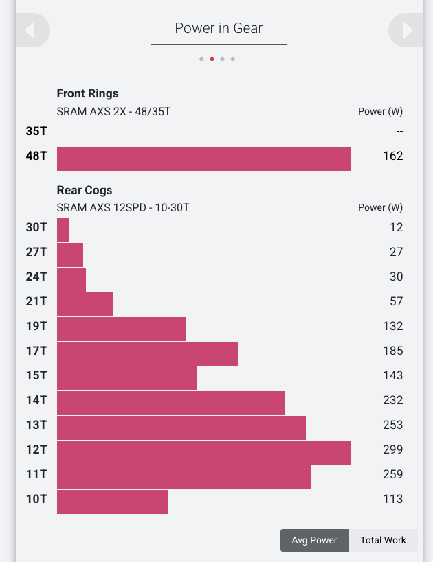 ギアごとの平均出力が表示されます。タブを切り替えることで、合計仕事量(Total Work)も表示できます。