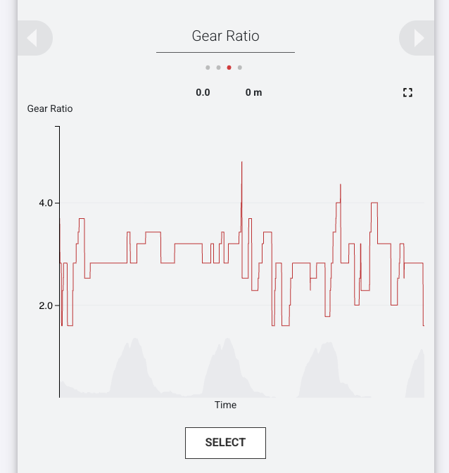 次に表示されるのはギア比です。フロントとリアのギアの組み合わせから、比率を計算した結果です。