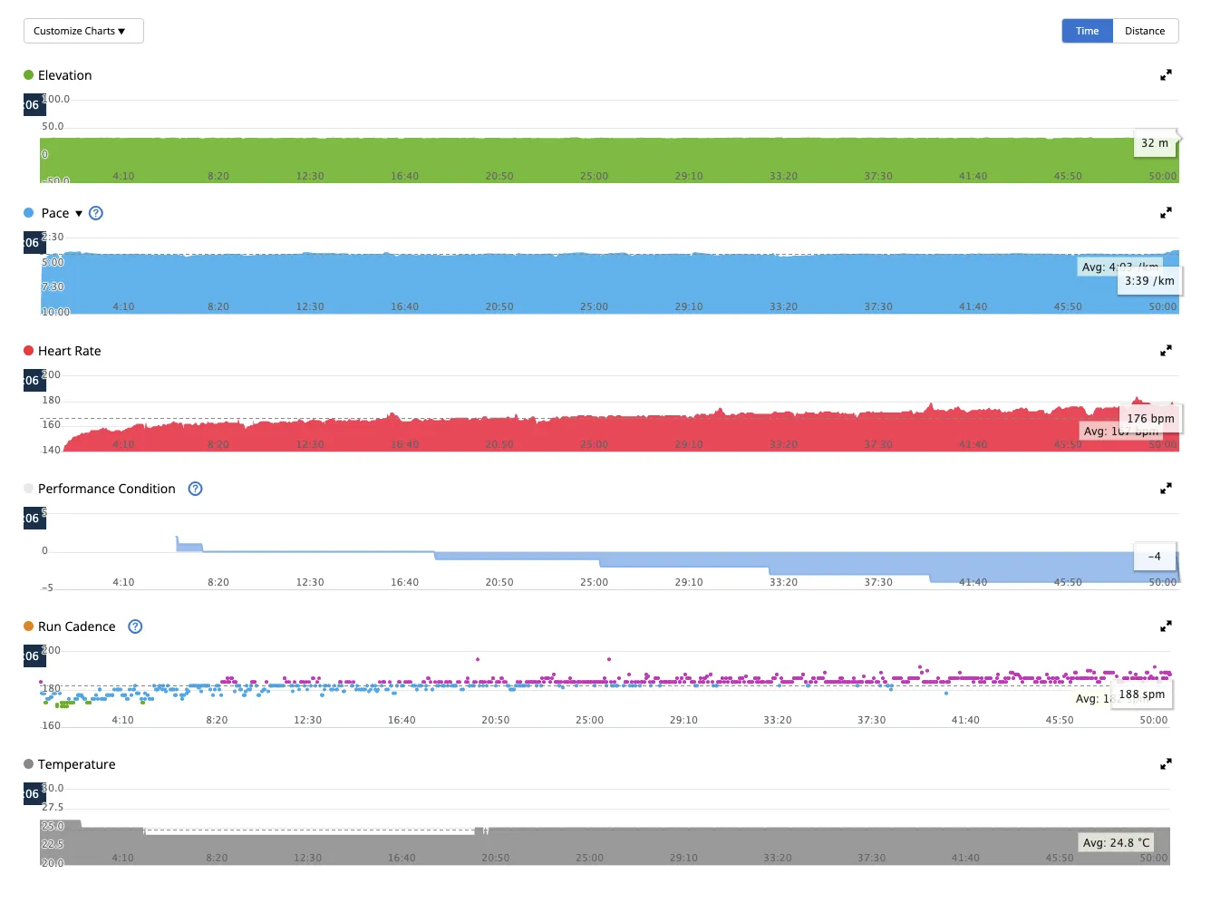 序盤の5kmは主観的強度は50%ぐらいと言う感じでしたが、1kmごとに10%主観強度が上がっていく感じです。心拍数も結構上がります。