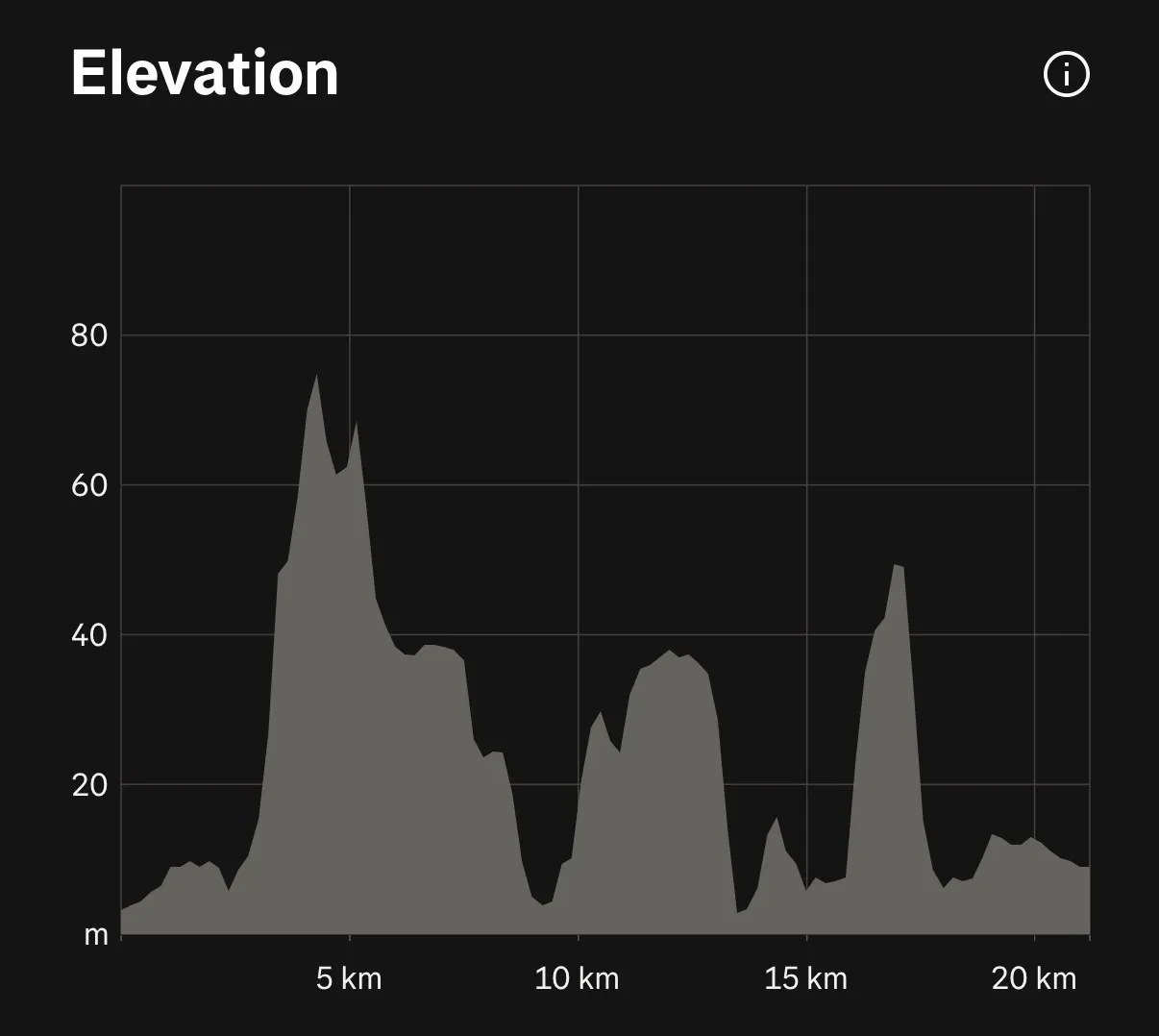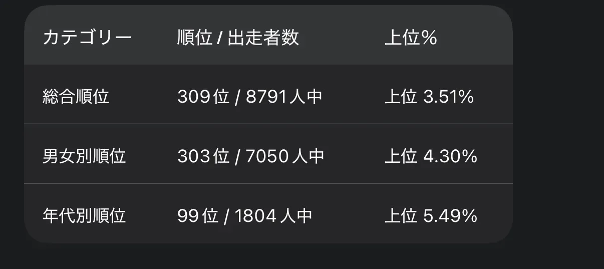 手元の計測でタイムは1時間34分5秒でした。練習していない割にはまずまずというタイムでした。