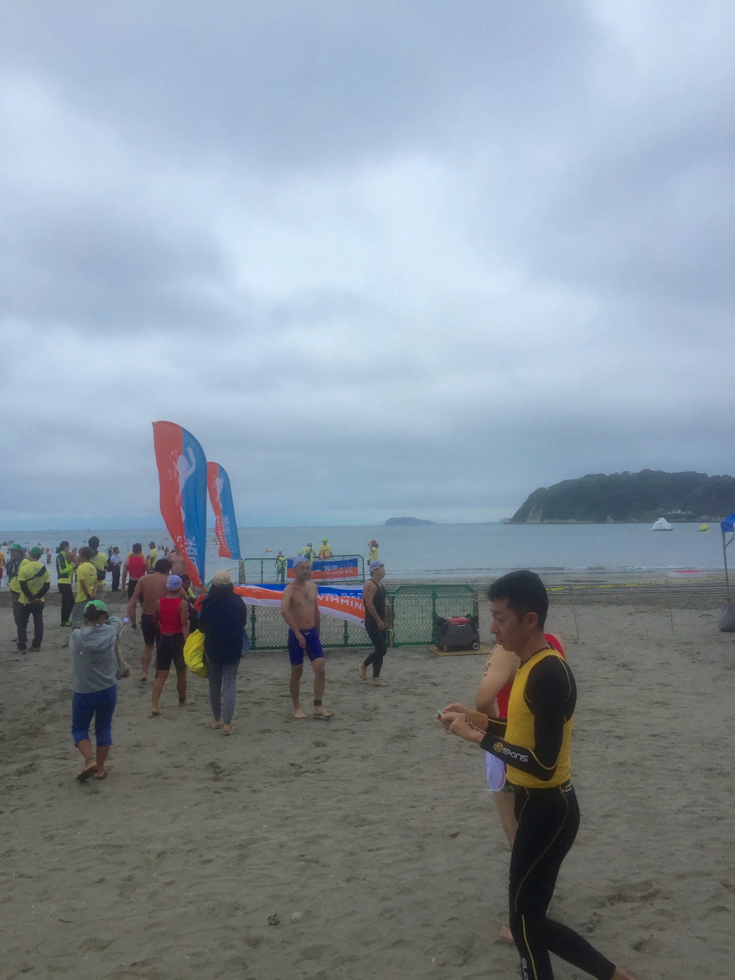 - 試泳して、スタートまでの待機の間、30分はずっと寒くてガクガクブルブルでした。60Lのビニール袋が支給されたので、それを着てました。